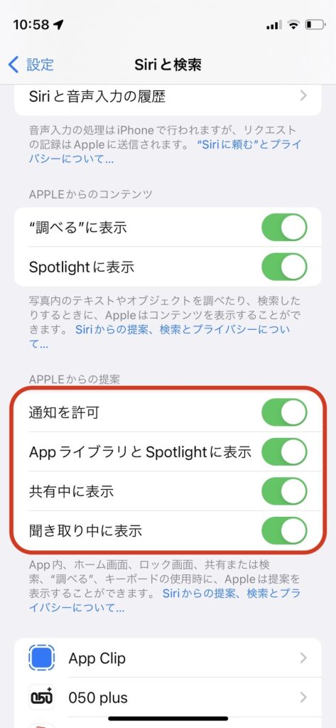 早速「Siriからの提案」を消したいと思います。
