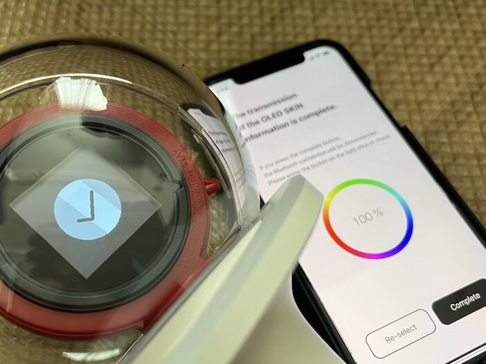 スキンの転送後は、完了ボタン(Complete)をタップして、一度Bluetooth接続を解除する必要があります。